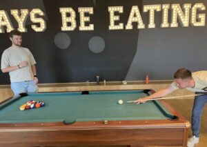 Right on cue, I take a break with a couple of games at the office pool table.